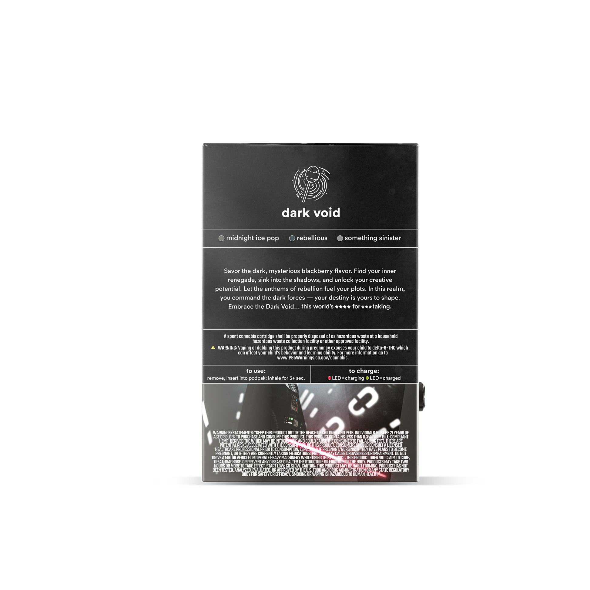 Savor the dark, mysterious blackberry blow pop flavor… Find your inner renegade, sink into the shadows, and unlock your creative potential. Let the anthems of rebellion fuel your plots. In this realm, you command the dark forces—your destiny is yours to shape. Embrace the Dark Void and may the force be with you.